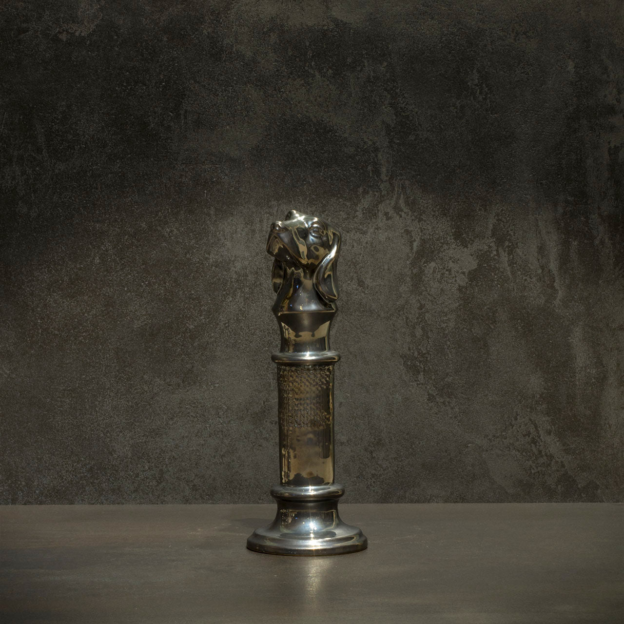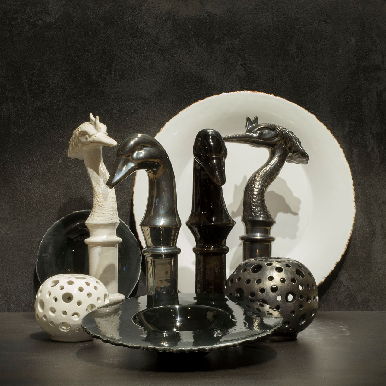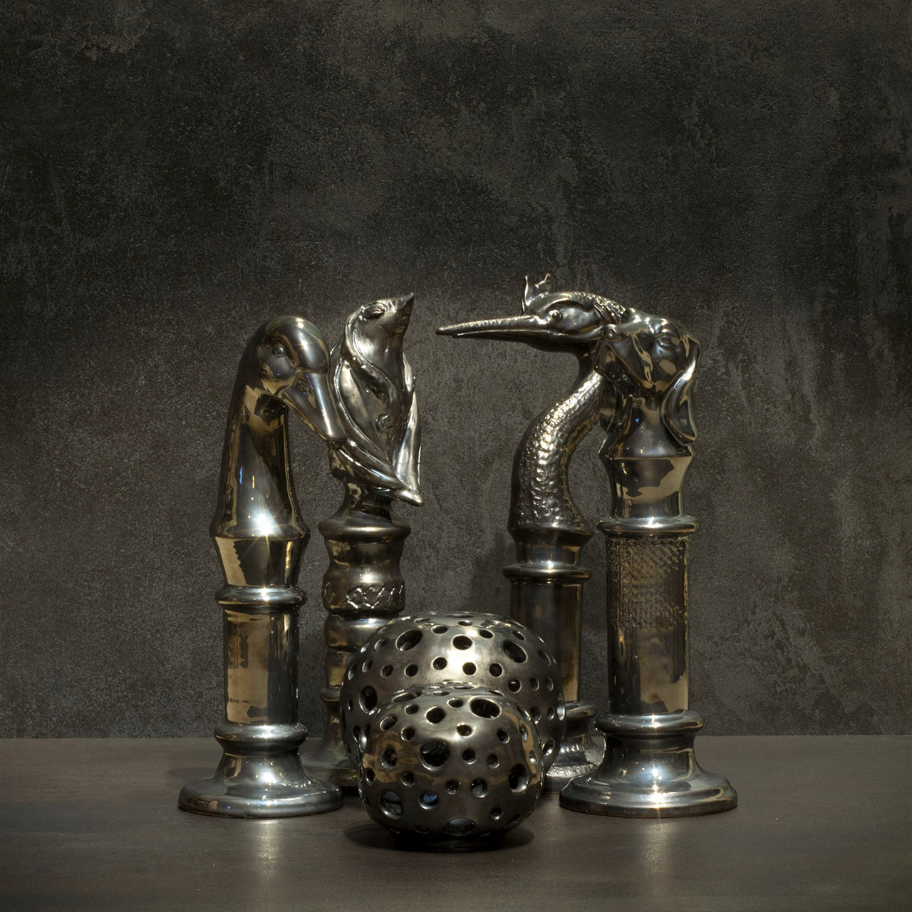 Animal sculptures with the abstraction of time and space at their center. The metaphysical column takes us back to antiquity, the animal symbols to archetypes, the shiny glazing to the contemporary, as a hybrid of worlds.